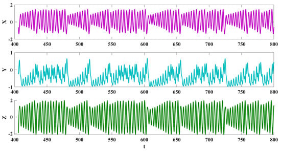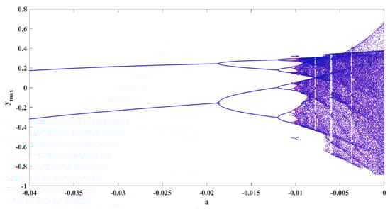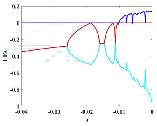 To study different dynamics of the oscillator, the bifurcation diagram is presented in Figure 5. In these diagrams, the maximum values of the three variables are plotted by changing bifurcation parameter a. The diagram is plotted by the backward continuation method, and the first set of initial conditions are . A period-doubling route to chaos can be seen in the bifurcation diagram. To confirm the existence of chaos, Lyapunov exponents (LEs) are computed with run time 20,000. Figure 6 presents the diagram of LEs by changing parameter a, corresponding to the bifurcation diagram. One positive LE shows chaotic behaviors.