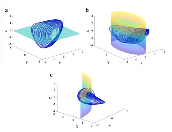 3D chaotic dynamics of Equation (1) and the three pre-located manifolds (a–c).
