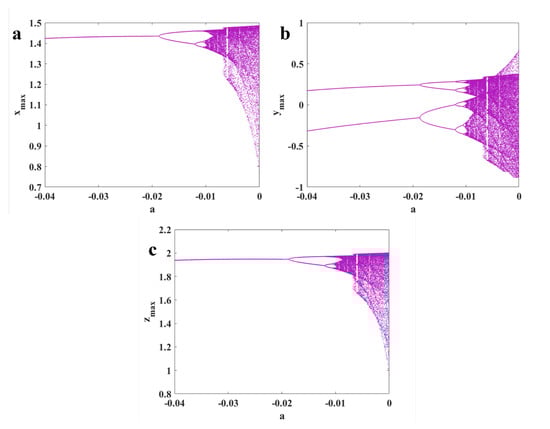 Bifurcation diagram of Equation (1) by changing parameter a and backward continuation method; maximum values of (a) x variable; (b) y variable; (c) z variable.