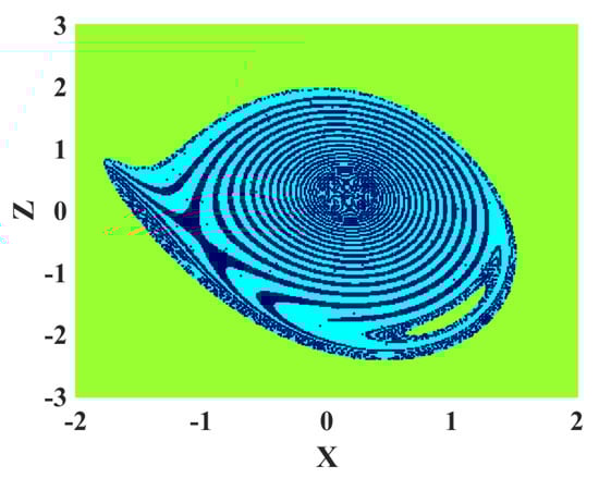 After revealing the coexisting attractors, investigating the basin of attraction of each attractor is interesting. Figure 8 shows the basin of attraction of the oscillator in parameter . It can be seen in Figure 7 that two periodic and chaotic dynamics coexist in this parameter. In Figure 8, the green, dark blue, and cyan regions show the basin of attraction for unbounded, periodic, and chaotic solutions.The basin of attractions of different attractors are entangled with each other.