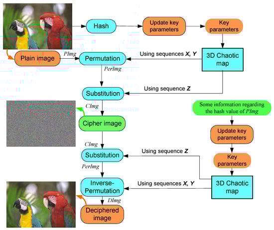 The presented image cryptosystem employs the benefits of our chaotic system to generate three pseudo-random sequences. The first two sequences are used to permute the plain image. Then the last sequence is utilized to substitute the permuted image for constructing the cipher image. The multimedia image cryptosystem is described in Figure 9, and the encryption procedure is listed in the following steps.