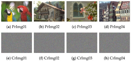 The utilized dataset of images is obtained from the Kodak database []. It consists of four images named Macaws, Chalet, Window, and Houses, with size 768 × 512 (see Figure 10). The utilized initial values to iterate the 3D chaotic map are = 0.6275, = 0.3854, = 0.7261, 0.