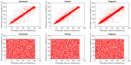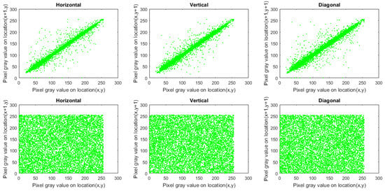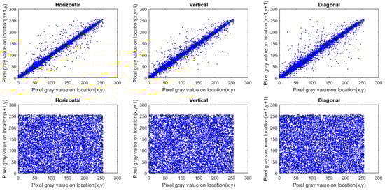 To study the perception of an image, we employ the correlation coefficient () of adjacent pixels. Ordinary images possess near 1 in each direction. Cipher images (constructed using a robust-designed image cryptosystem) should be approximately 0. To calculate for the original and encrypted images, we picked 10,000 pairs of adjacent pixels at random in every direction.