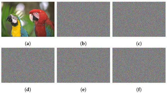 Outcomes of decrypting Cipher–Macaws image using slight changes in the confidential key. (a) The confidential key; (b) The confidential key except = 0.627500000000001; (c) The confidential key except = 0.3854000000000001; (d) The confidential key except = 0.7261000000000001; (e) The confidential key except = 0.627499999999999; (f) The confidential key except = 0.38539999999999.