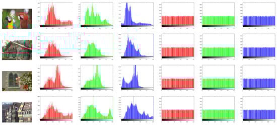 To evaluate the pixel values’ distribution in the encrypted images, the histogram test is employed. A proper image cryptosystem has to guarantee the identical distribution for varied cipher images. Figure 15 plots the histograms of the studied images. The histograms of the plain images are not similar, while the histograms of their related ciphered ones are uniform. Additionally, we applied chi-square () analysis to guarantee the histogram results.