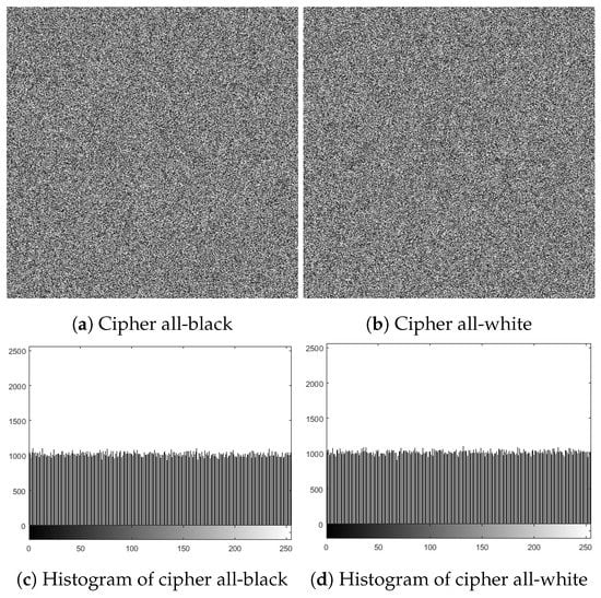 In general, the cryptanalysis of a cryptosystem assumes that cryptanalysts fully understand the structure of the cryptosystem and know all things about the encryption and decryption algorithms except the secret key utilized in encryption and decryption procedures. There are four kinds of attacks: ciphertext-only, chosen-ciphertext, chosen-plaintext, and known-plaintext []. The chosen-plaintext attack is considered to be the most effective attack in which the cyberpunk has temporary access to the cryptosystem and can create the ciphertext associated with the selected plaintext. If an encryption algorithm is able to resist the chosen-plaintext attack, it has the capability to resist other kinds of attacks. In the proposed encryption algorithm, if any of the initial keys (, , , and a) have a slight modification, the outcome will change vastly. Furthermore, our encryption approach applies SHA256 to the plain image for updating the initial parameters, so that our cryptosystem not only depends on the secret key but also on the plain image. The cryptanalyst attempts to acquire useful information about the secret key utilizing all-white and all-black images, as they can disable the task of permutation/substitution procedures. The affiliated cipher images for the all-white and all-black images and their related histograms are provided in Figure 16, in which no visual information can be acquired from these cipher images, while Table 7 supplies some statistical analyses for these images. As a result, our cryptosystem has the capability to resist linear cryptanalysis.