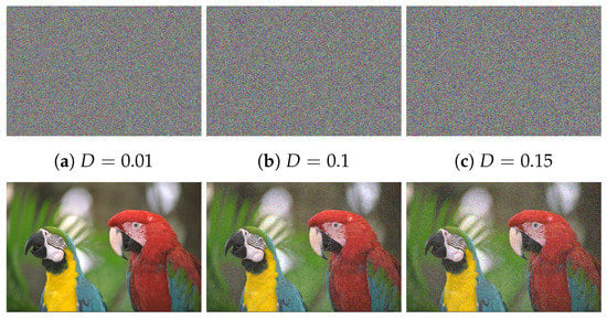 Outcomes of noise attack, in which the top row refers to the defective Cipher–Macaws image by adding Salt and Pepper noise with variable densities (D) while the bottom row represents the corresponding decipher image.