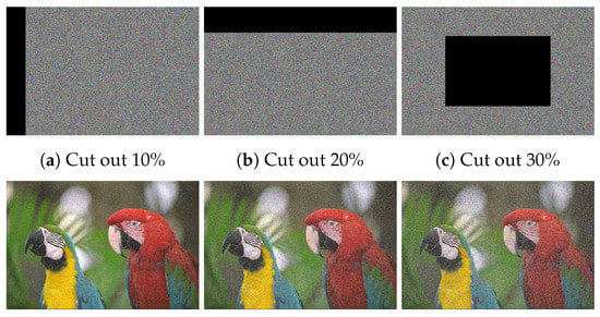 It is significant that most of the data transmission networks are noisy channels. Once data are transmitted over noisy networks, it is probably distorted by noise or data loss attacks. So, a well-designed cryptosystem should withstand data loss and noise attacks. For investigating the proposed image cryptosystem for facing data loss and noise attacks, we defect the Cipher–Macaws image via performing a cutting block for data with various sizes or applying Salt and Pepper noise with variable densities. Then we decipher the defective image. The outcomes of noise and data loss attacks are displayed in Figure 17 and Figure 18, respectively. The deciphered images have a well-visual quality with no lack of visual details inside the area of the cutting portion.