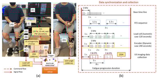 (a) Experimental setup of the isometric (left) and dynamic (right) ankle joint dorsiflexion by using FES. A—FES electrode pads, B—Prodigy US transducer, C—Load cell platform, D—Incremental encoder, E—FES stimulator, F—Monitor showing B-mode US imaging, G—Prodigy US machine, H—Safety stop button. (b) Data synchronization and collection among multiple channels.