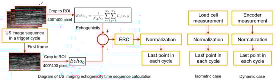 Diagram of data processing, including US imaging echogenicity, load cell, and encoder measurements under both isometric and dynamic conditions.