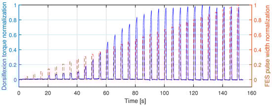 The experimental results from the first task on Sub01 are presented in Figure 3, where the monotonically increasing FES pulse width and ankle dorsiflexion torque are normalized to their corresponding peak values during the entire task. The threshold pulse width amplitude of each individual was taken as the amplitude that produced the first significant increase of the dorsiflexion torque, while the pulse width saturation was taken as the amplitude that no longer generated a significant increase of dorsiflexion torque. According to the dorsiflexion torque increase in Figure 3, the pulse width threshold and saturation for Sub01 are around 100 μs and 420 μs, respectively. Similarly, the same determination approach was applied to all other participants, and the pulse width threshold and saturation values are summarized in Table 1.