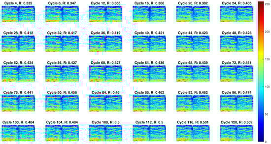 Taking the FES-induced TA muscle fatigue under the dynamic condition on Participant Sub03 as an example, the qualitative evaluation of muscle contractility characteristics during the fatigue progression can be visualized in Figure 4. The first and last frames of US imaging from every 4 stimulation cycles were selected and compared in each subplot of Figure 4. According to the negative correlation between the echogenicity signals and muscle contraction levels in [39], the hyperechogenic (with higher gray-scaled values) and hypoechogenic (with lower gray-scaled values) US images represent less and more muscle contraction force, respectively. It is observed that with the increase of stimulation cycles, the last frame of US imaging becomes more hyperechogenic, which indicates the TA muscle force generation ability decreases. The 2D correlation coefficient between the presented two frames in each stimulation cycle was also calculated and shown in each subplot. A higher correlation coefficient represents smaller deformation of the targeted muscle, indicating less muscle contraction force generation. It is observed that the correlation coefficient increases along with the stimulation cycles, representing the reduced muscle force generation due to FES-induced muscle fatigue. A similar changing pattern of US imaging was also observed under the isometric and dynamic conditions of other participants. Representative videos displaying the temporal and spatial changes of TA muscle US imaging under both isometric and dynamic FES-induced fatigue progression on Sub03 and Sub05 are included in the Supplementary Materials.