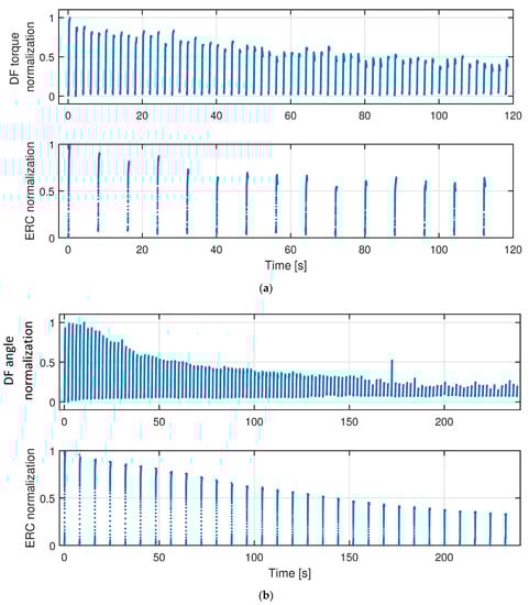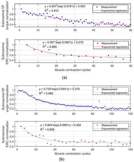 To evaluate the FES-induced fatigue, the reduction of dorsiflexion torque or angle was considered as the benchmark. Corresponding to the benchmark, we observed the reduction of ERC during the muscle fatigue progression. The representative results of TA muscle fatigue progression from Sub03 are shown in Figure 5, where each curve on the top subplot represents dorsiflexion torque (a) or angle normalization (b) continuous change during each recorded contraction cycle. Each curve on the bottom subplot represents the corresponding ERC normalization change during the first recorded contraction cycle every 4 stimulation cycles. As mentioned in the last section, the last data point of each variable curve was selected, which represents the sub-maximal value for each variable during each recorded contraction cycle. The scattered plots between the last data point of each variable and TA muscle stimulation cycle are presented in Figure 6. Remarkably, all signals show a monotonic decay trend with the muscle fatigue progression. In Figure 6a, the sub-maximal dorsiflexion torque reduces to 50% of the pre-fatigue capability after about 35 contraction cycles, while the sub-maximal dorsiflexion angle reduces to 50% of the pre-fatigue capability after about 30 contraction cycles. Additionally, after 60 stimulation cycles, the dorsiflexion torque and angle decayed to 39.2% and 31.2% of the pre-fatigue capacity under isometric and dynamic conditions, respectively. The results indicate that, with the same FES intensity and same muscle stimulation cycles, the fatigue levels of the TA muscle are similar under isometric and dynamic conditions. However, the participants reported that they feel more comfortable during the fatigue progression under the dynamic condition. Under both conditions, as the increase of muscle contraction cycles, the isometric dorsiflexion torque and dynamic dorsiflexion angle present a strong exponential decay. The exponential regression equations and R2 values are labeled on upper plots of Figure 6a,b. On lower plots of Figure 6, although with even sparser measurement points, a strong exponential relationship is still observed between the ERC normalization and the stimulation cycles for both isometric and dynamic conditions. The exponential regression equations and values are labeled in Figure 6. For other participants, the coefficients of exponential regression models and corresponding values are listed in Table 2, where the upper (lower) half represents the regression model between dorsiflexion torque/angle normalization (ERC normalization) and contraction cycles.
