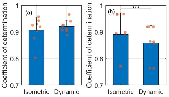The comparison results of the coefficients of determination under isometric and dynamic conditions. (a) Exponential regression model between the dorsiflexion torque/angle normalization and muscle contraction cycles, (b) Exponential regression model between the ERC normalization and muscle contraction cycles. *** represents the significant difference level of .