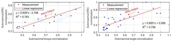 Linear relationships between the sub-maximal US ERC normalization and sub-maximal dorsiflexion torque/angle normalization under isometric/dynamic muscle fatigue progression conditions. Reported data are from Participant Sub05.