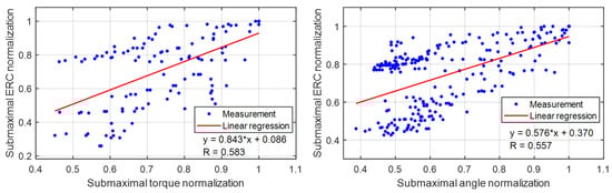 Coefficients of linear regression models () and values between dorsiflexion torque/angle normalization and ERC normalization.