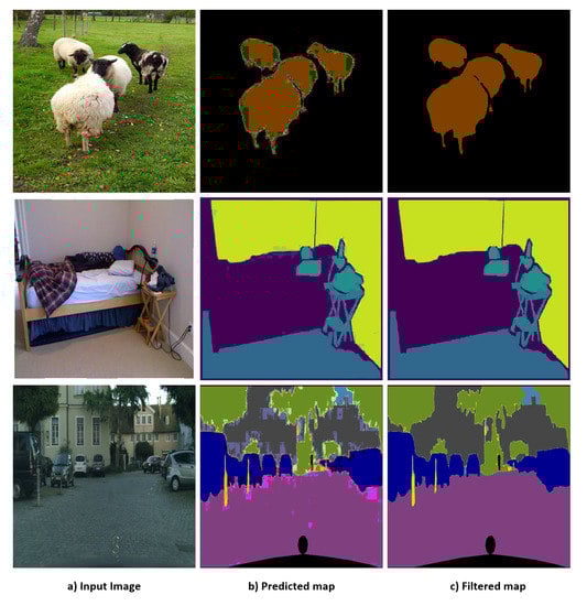 This filtration method efficiently removes the noise from the image and provides clear edges. However, performance degradation occurs in extremely dense cases where the segmentation mask has a large number of classes and almost all pixels have widely differing labels (e.g., for the Cityscapes [4] dataset, in which the scenes are very crowded with small labels and many different classes). However, the method performs very well on the Pascal VOC2012 and NYUV2 datasets, in general. Figure 1 presents sample images that clearly show the difference before and after filtration. Figure 2 presents a visual illustration of the filtration step as a component of the overall proposed method.