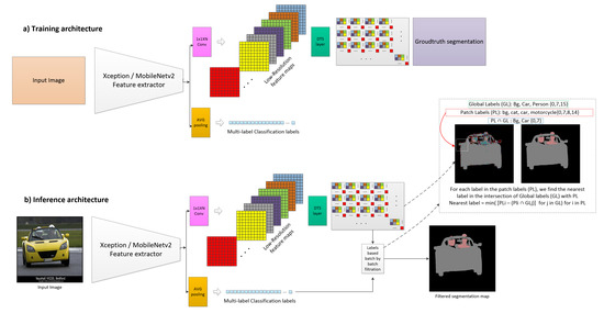 The architecture of the proposed method. With an Xception (DTS-NET) or MobileNetV2 (DTS-Net-Lite) backbone, the DTS layer (module) is added after a convolutional layer. The pixels in the low-resolution feature maps are arranged in an segmentation map. Another branch features global average pooling and a fully connected layer is added for multi-label classification. (a) Training architecture of the proposed method and (b) inference architecture, which features one additional step, that is, the nearest label filtration (NLF). NLF is a patch-by-patch image filtration based on the global labels of the image and the patch labels. The noisy pixels with labels that are not included in the global image labels are mapped to the nearest neighbor in the intersection between the patch and global labels using a simple iterative difference operation.