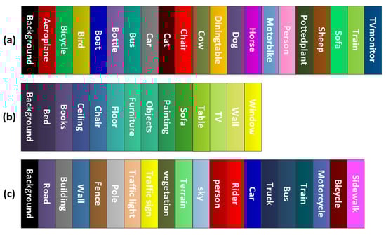 Class definitions and colormaps for the used benchmarks. (a) PASCAL VOC2012 [2] class definitions and colormap, (b) NYUV2 [3] class definitions and colormap, and (c) Cityscapes [4] class definitions and colormap.