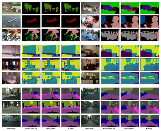 Sample results of predicted and NLF-filtered semantic segmentation (NLF Seg) results that were obtained using DTS-Net on PASCAL VOC2012 (rows 1–3), NYUV2 (rows 4–6), and CITYSCAPES (rows 7–9), with input images and ground-truth segmentation masks (Seg).