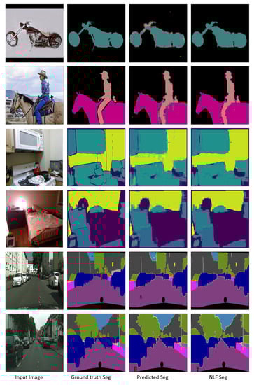 Promising mIOU values were exhibited by the proposed method on the three datasets, particularly with the application of the NLF technique. Figure 7 shows sample results from the three datasets with the predicted and filtered (NLF Seg) segmentation results. On the PASCAL VOC2012 benchmark, DTS-Net and DTS-Net-Lite attained mIOU values of 91.1% and 83.8% on the validation set, respectively. On the NYUV2 test benchmark, DTS-Net attained high accuracy with a pixel accuracy (Pix.acc.) of 80.72%, while DTS-Net-Lite attained a pixel accuracy (Pix.acc.) of 73.7%. On the CITYSCAPES validation benchmark, DTS-Net and DTS-Net-Lite attained mIOU values of 80.72% and 61.5%, respectively. These mIOU and Pix.acc. values were superior to those of all SOTA methods for semantic segmentation, even though the proposed architecture is far simpler than the SOTA-method architectures.