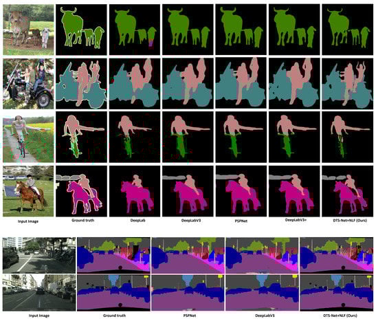 Quality comparison between the semantic segmentation results obtained from the proposed method (DTS-Net+NLF), DeepLab, DeepLabv3, PSPNet, and DeepLabv3+ on PASCAL VOC2012 validation benchmark, and between DTS-Net+NLF, PSPNet, and DeepLabv3 on CITYSCAPES validation benchmarks.