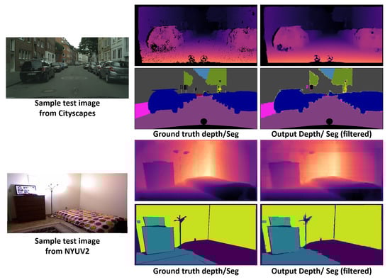 We further trained the proposed method on the simultaneous task of semantic segmentation and depth estimation. NYUV2 provides dense depth data captured by a Kinect sensor that is suitable for direct use, and CITYSCAPES provides disparity data that are equivalent to depth (as the disparity has a linear relationship with the depth). Here, we trained DTS-Net on the disparity without conversion. We trained our main model, DTS-Net, on NYUV2 with an image size of and on Cityscape with an image size of for the depth estimation and semantic segmentation tasks. For the depth estimation, we added a third branch, which was identical to the branch for the segmentation branch, that is, a 1 × 1 × 1024 convolutional layer followed by a DTS layer to construct the depth map. We retained the two main branches, that is, the semantic segmentation branch and the multi-label classification branch. We then trained the network for 1000 epochs under the same hardware configuration, as previously mentioned in Section 4.4. As the depth estimation and semantic segmentation have a common training procedure and the aim is a dense map, we believe that the two tasks help each other. This is confirmed in Section 5, where the accuracy and error values for the depth are reported; these values were obtained simultaneously with the performance of the semantic segmentation task.