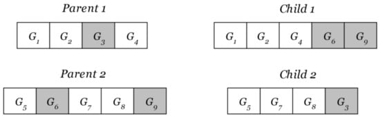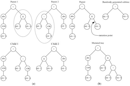 Several genetic operators are used to evolve each generation to find the optimum solution within the search space. The first is the selection operator, which obtains a subpopulation, , where  is the number of selected individuals [,]. The other common operators are crossover and mutation. Once parents are selected from the population, subtree crossover selects a point on both parents which will be exchanged. Care must be taken so that the arity of the selection points are the same. An example of subtree crossover is shown in Figure 1a. The mutation operator selects an individual and a tree node is selected at random, a new tree is generated with a depth no greater than the difference of the maximum allowable depth and the depth of the randomly selected node. An example is shown in Figure 1b.