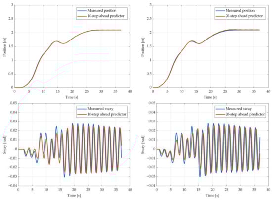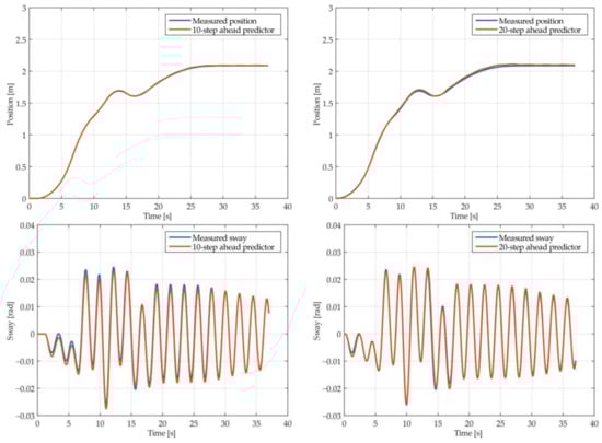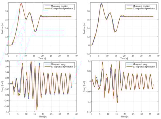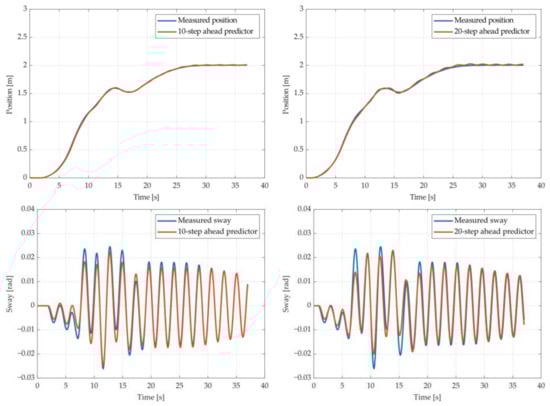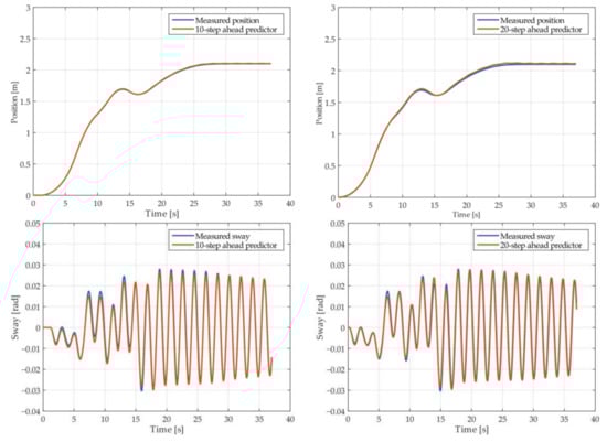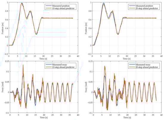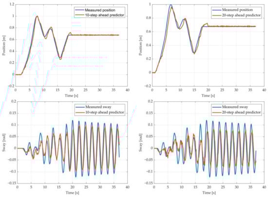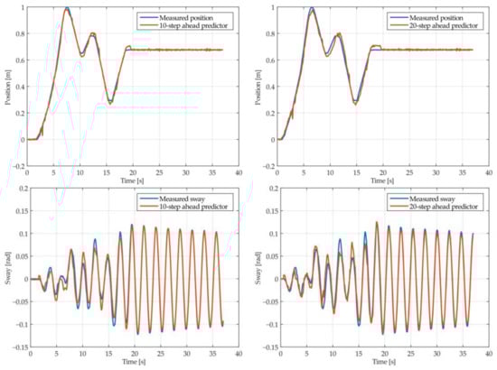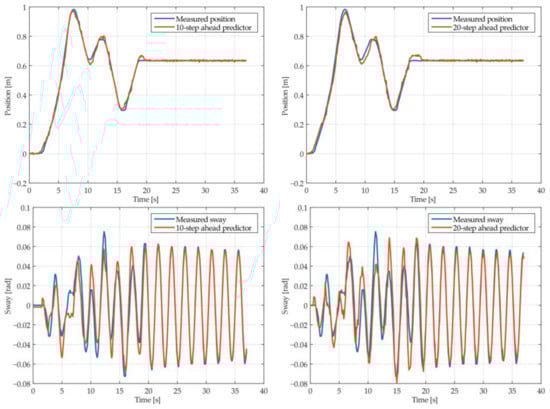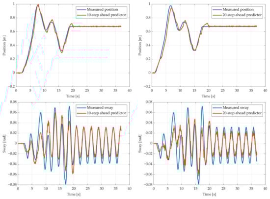 The 10- and 20-step ahead prediction with the ARX model of the experimental crane position and payload sway with 1.3-meter rope and 40 kg payload mass.