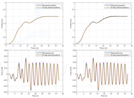 The results of the MGGP and ARX models’ 10-step and 20-step ahead prediction of the crane position and payload sway were compared with the testing data obtained from the numerical simulations in Figure 5, Figure 6, Figure 7, Figure 8, Figure 9 and Figure 10, respectively. The normalized mean square error and the R2 of the position and sway prediction for the 10-step ahead and 20-step ahead prediction for the MGGP model and ARX model are given in Table 5. We noticed that the position model obtained by the MGGP has a similar structure to the ARX model with an additional nonlinear term. The MGGP model and ARX model accurately predicted the position of the crane with no significant loss of accuracy as the prediction step increased. However, the ARX model was a poor predictor of the payload sway, and there was a significant loss of accuracy as the prediction step was increased. The mean and standard deviation of the NMSE for the MGGP sway model were 0.0586 and 0.0021 for the 10-step ahead predictor and 0.0518 and 0.0209 for the 20-step ahead predictor, while for the ARX sway model they were 0.2387 and 0.0933 for the 10-step ahead predictor and 0.3714 and 0.1514 for the 20-step ahead predictor. The mean and standard deviation of the NMSE for the MGGP position model were 0.0015 and 2.0616 × 10−4 for the 10-step ahead predictor and 0.0047 and 1.7321 × 10−4 for the 20-step ahead predictor, while for the ARX sway model they were 0.0028 and 5 × 10−5 for the 10-step ahead predictor and 0.0044 and 1.4141 × 10−4 for the 20-step ahead predictor.