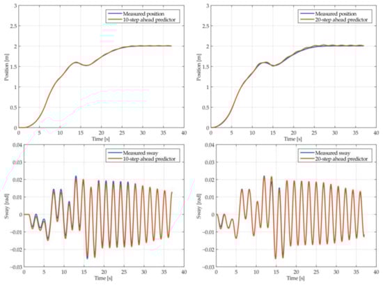 The 10- and 20-step ahead prediction with the MGGP model of the experimental crane position and payload sway with 0.9-meter rope and 40 kg payload mass.