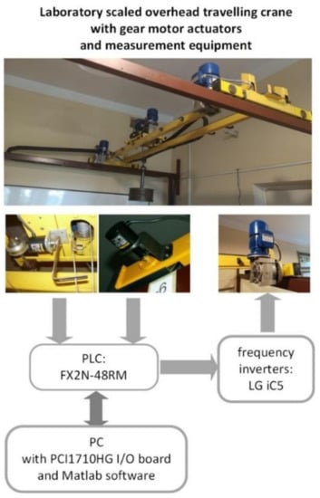 Crane dynamic model identification was based on data measured during experiments carried out on the laboratory-scaled overhead traveling crane presented in Figure 11. The identification was focused on the double girder crane mechanism driven by the two AC gear motors with 0.18 kW output power, 1400 rpm speed and 15.5 gear ratio, which were supplied by the two LG iC5 0.4 kW frequency inverters. The crane system was controlled by using the Mitsubishi FX2N series programmable logic controller (PLC). The crane’s bridge position was measured by using the incremental encoder with a resolution of 400 pulses per rotation (ppr), while the sway angle of a payload suspended on the rope was measured using the encoder with a resolution of 2000 ppr, which was installed under the trolley and connected with fork-bottomed arms embracing the hoisting rope. The experimental data were measured with a sample time of 0.1 s using PC (8GB RAM, CPU Intel Core i7-6700K Quad Core 4GHz, Windows 10) equipped with the I/O board (PCI1710HG) and MATLAB software release R2020.
