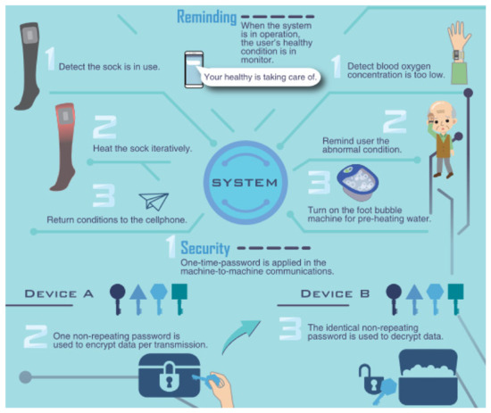 In the proposed IoT ecosystem, a mechanism has been added that repeatedly tests until a nonrepeted random number, which can be used as the key for D-OTP appications, is obtained. In practice, D-OTP is a secure transmission system suitable for IoT devices. We have applied D-OTP to several health-care devices, such as sensor bracelets, heated socks, and foot baths, as illustrated in Figure 5.