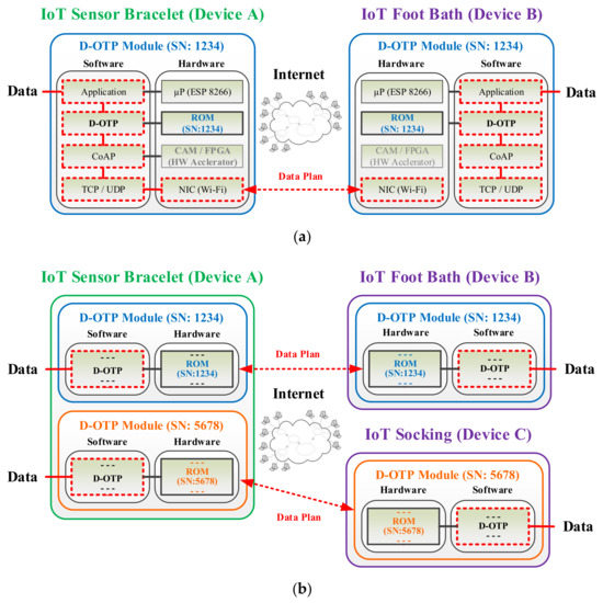 Figure 6a illustrates a D-OTP data transmission example between two healthcare IoT devices (device A and device B). Notably, as a communication pair, the identical SN of “1234” is recorded in the ROMs of the paired D-OTP modules equipped in devices A and B, respectively. As Figure 6b shows, device A can furthermore communicate to another additional device (device C). Accordingly, device A shall be equipped with two D-OTP modules, one for the original device B (with SN “1234”) and another for added device C (with SN “5678”). In accordance with the OTP rule, the SN of device C is nonrepeating to that of device B. Afterward, the two D-OTP modules in device A can be combined into a single one with two SNs to reduce manufacturing costs.