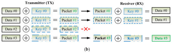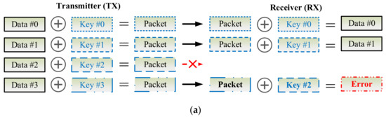 Another key synchronization issue is how to deal with transmissions in different directions between the communication pair. As Figure 11a shows, at the first two transmissions, the keys are changed sequentially. However, at the third transmission, device A and device B transmit (TX) packets to each other simultaneously, such a race condition leads to the error decoding results because both devices use key #3 to decrypt the received packet encryped by key #2. As Figure 11b illustrates, to deal with this problem, a simple method is that, a device shall use keys for TX and RX, separately. In other words, TX key #0 of device A is different from TX key #0 of device B, but TX key #0 of device A is identical to RX key #0 of device B, and vice versa. Therefore, a device needs two SNs to generate independent TX and RX keys. In practice, a proposal is that, to use a SN for TX and the ones’ complement of the SN is for RX, where the ones’ complement of a binary number is the value obtained by inverting all the bits in the binary representation of the number.