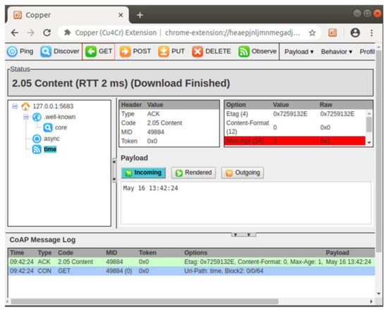 The implementation using libcoap includes two programs, one is CoAP server and the other is CoAP client. First, we performed the initial functions, the implemented CoAP server was enabled to await endpoint connections from multiple clients. Next, we initiated the CoAP client to receive information from the CoAP server. A Copper CoAP user-agent [39] was also applied as a graph user interface and obtained the time and date information from the identical CoAP server, as presented in Figure 12, to further assess the accuracy of the communication handshakes between the CoAP sever and CoAP client.