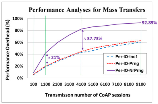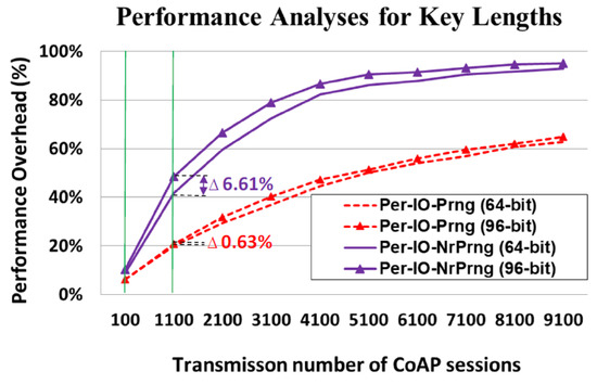 To overcome these concerns, the “change key per CoAP io” phase (Figure 9) of our designed mechanism can be optionally applied to update the value of the key through the specifications “per CoAP session” or “per CoAP io” in a single CoAP session. The new key, the 64-bit number of “5301919777550” presented in Equation (5), which is dynamically updated, provides improved security compared with the original static key. The experimental results are presented in the following sections.