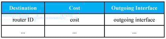 - Shortest Path Table was designed to optimize routing to decrease network delay. As shown in Figure 2, the fields of Shortest Path Table (SPT) include Destination, Cost, and Outgoing Interface. Destination is the router ID. Cost obtaining content from the designated router might be measured by response time, hop count, or other metrics. Outgoing Interface is the outgoing interface to a certain destination. In this paper, the path is calculated using a dynamic routing algorithm (OSPF), which is described in Section 3.2.Figure 2. Shortest path table structure.