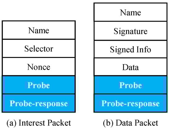 Compared to other content explorations that periodically and completely send designated packets to explore the distribution of cached content, our approach improves the diversity and miss rate of FIB with minimal network overhead by appending fields to conventional interests and data packets. Two fields, probe and probe-response, are added to both the interest packet and the data packet, as shown in Figure 3a,b.