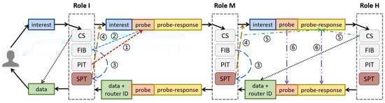 H router adds its ID to the data packet. In addition to the M router steps, the probe and probe-response in the interest are replicated to the data packet (see line ⑥ in Figure 4).