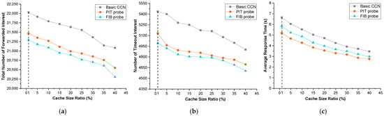 Impact of cache size ratio. (a) Total number of forwarded interests; (b) number of timeout interests; (c) average response time.