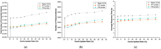 To quantitatively evaluate the routing complexity of our approach, the number of timeout interests and average response time are utilized as measurement parameters. In Section 3.3, the additional complexity of our approach combined with the algorithm was qualitatively explained in detail. Compared to the basic CCN, the additional time complexity of our approach are O(NCS + Nrt + NFIB ∗ NSPT) and O(NFIB) on processing interest packets and data packets, respectively. However, the results in Figure 6b,c show that our approach outperforms the basic CCN in terms of the number of timeout interest packets and average response time of the consumer. PIT probe and FIB probe, respectively, reduce the number of timeout interest packets by 6.11% and 7.23%, and the average response time of consumer by 1.08 s and 0.64 s. The main reason is that the probe-based approach uses probe to find the best content providers to improve the routing table’s accuracy, allowing more interests to be satisfied by nearby routers and thereby reducing interest transmission. These benefits compensate for the additional computing overhead of packet processing in each router.