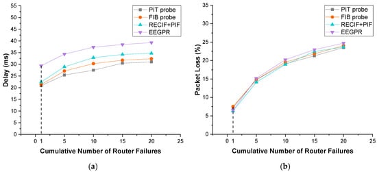 Impact of router failures. (a) Delay; (b) packet loss.