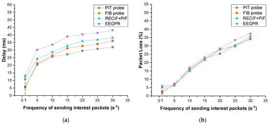 Figure 8 illustrates the impact of router failures on the performance of our approach, RECIF+PIF [] and EEGPR []. This simulation adopts PoP-level SPRINT topology [,]. To simulate the failures of routers, several routers are randomly selected to crash after running half of the simulations. Furthermore, the centrality threshold and retransmission threshold of RECIF+PIF has been set to 9 and 5, respectively. All results are the average of five simulations. As demonstrated in Figure 8a,b, as the number of router failures increases, so does network delay and packet loss. In particular, the delays of RECIF+PIF and EEGPR are 5.4 ms and 9.9 ms longer than that of the PIT probe, respectively. EEGPR only improves the routing table for data packets while RECIF+PIF focuses on decreasing the number of interests instead of improving the routing table to speed up routing.