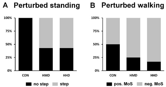 (A) Percentage of participants who required to regain balance in perturbed standing with and without taking a step for control condition (CON), head-mounted display (HMD) and hand-held display (HHD). (B) Percentage of participants with negative and positive MoS for CON, HMD and HHD for perturbed walking.