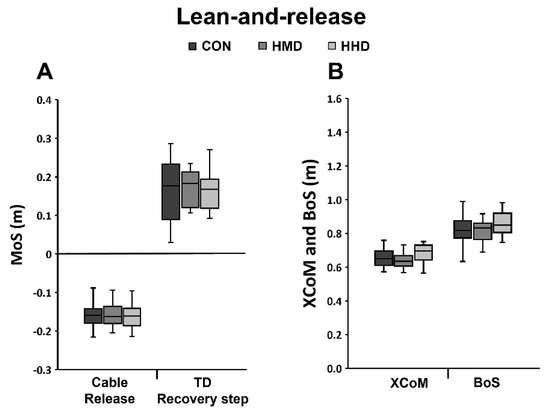 The margin of stability (MoS) and related stability components for the lean-and-release task illustrated with box plots (median, 1st and 3st quartile and whiskers) of all analysed participants for the control condition (CON), head-mounted display (HMD) and hand-held display (HHD). (A) MoS at the instants of release and at touchdown of the recovery step (TD); (B) extrapolated centre of mass (XCoM) and base of support (BoS) at TD of the recovery step.