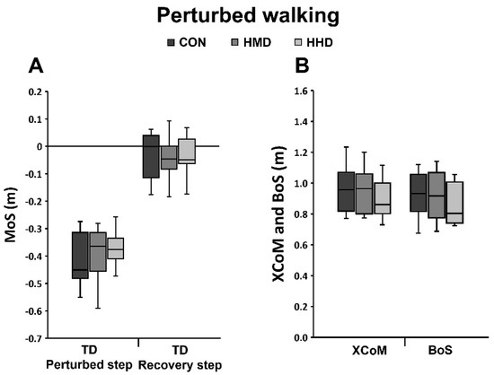 The margin of stability (MoS) and related stability components during unperturbed and perturbed walking illustrated with box plots (median, 1st and 3st quartile and whiskers) of all analysed participants for control condition (CON), head-mounted display (HMD) and hand-held display (HHD). (A) MoS at touchdown (TD) of the perturbed step and at touchdown of the first recovery step; (B) extrapolated centre of mass (XCoM) and base of support (BoS) at TD of the first recovery step.