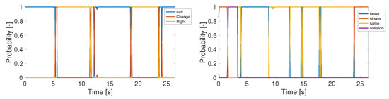 Losing distance corresponding to the first row and column corresponds to a gaining distance maneuver associated with the second, following the distance keeping prerogative. The last row and column are responsible for collision warnings. The probabilities of the observed maneuvers using the CTRA motion model can be seen in Figure 4. The left side of the figure shows the probabilities regarding the lateral maneuvers. The right side is corresponding the longitudinals.