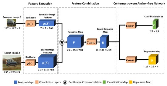 where ★ represents the cross-correlation operation, and , , and denote the k-th channel of , , and P, respectively. Furthermore, a convolution layer is employed to fuse the response map and reduce the dimension from 768 channels to 256 channels. Through the dimension reduction operation, the number of parameters can be reduced to speed up the following computation. The response map with the reduced dimension is denoted as R and employed as the input to the centerness-aware anchor-free network.
