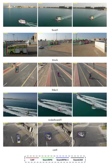 Qualitative comparisons between the proposed tracker CAT and representative trackers SiamRPN [8], SiamRPN++ [17], and SiamCAR [11] on boat3 (first row), truck1 (second row), bike1 (third row), wakeboard5 (fourth row), and car8 (bottom row) sequences that involve large scale variations and aspect ratio variations. Compared to other trackers, even facing challenging scenarios including occlusion, large scale variations, and aspect ratio variations, CAT provides accurate state estimations that significantly improve the robustness and accuracy in tracking.